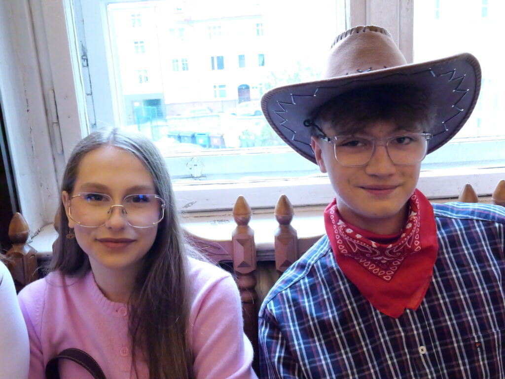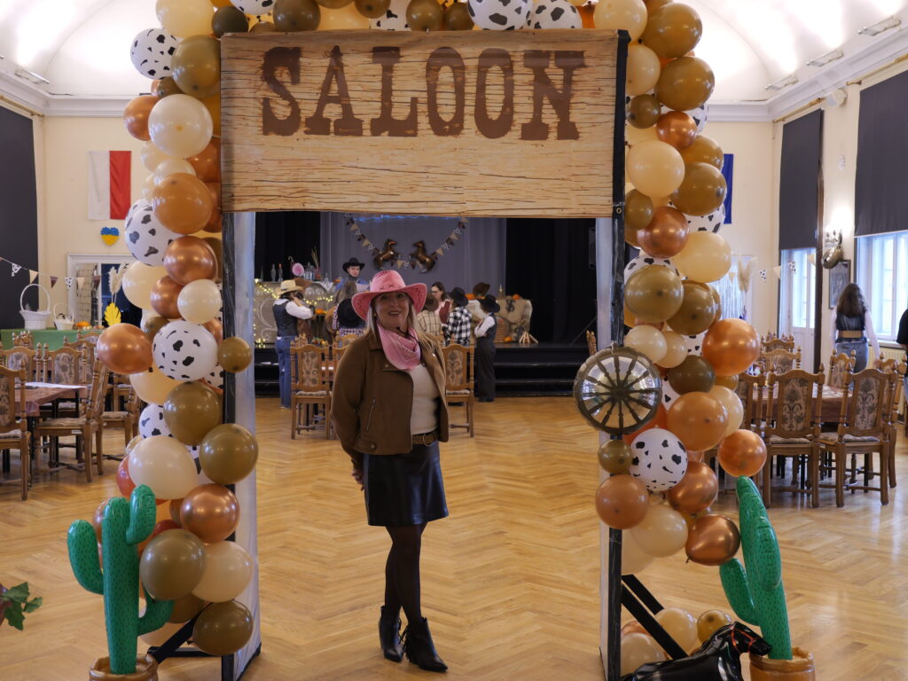 Tegoroczny Dzień Nauczyciela przeniósł nas w samo serce Dzikiego Zachodu! Aula naszej szkoły zamieniła się w prawdziwy saloon, a uczniowie i nauczyciele w kowbojów, pionierów i mieszkańców prerii. Zamiast sprawdzianów i kartkówek czekały emocje, śmiech i pełne serdeczności słowa wdzięczności. Prowadzący w westernowych strojach wprowadzili wszystkich w magiczny klimat szkolnej prerii. Podkreślali, że tego dnia nie ma klas ani obowiązków – jest tylko wspólna zabawa i czas, by powiedzieć nauczycielom „dziękujemy”. Szczególne słowa wdzięczności skierowano do Pani Dyrektor – „Szeryfowej” szkolnego miasteczka – za jej serdeczność, otwartość i mądrość, bo jak mawiali starzy starzy pionierzy: „Nie ten jest wielki, kto trzyma rewolwer, lecz ten, kto potrafi trzymać serce na dłoni.”-a Pani Dyrektor potrafi jedno i drugie-stwierdzili prowadzący. Uczniowie dziękowali wszystkim nauczycielom za cierpliwość, wyrozumiałość i za to, że każdego dnia „sieją ziarna dobra” w sercach swoich uczniów. Nie zabrakło też emocjonujących konkurencji! Uczestnicy mogli spróbować swoich sił np. w chwytaniu kaktusów na lasso, strzelaniu strzałami do celu czy wykazać się wiedzą o Dzikim Zachodzie. Zabawa była naprawdę wspaniała, a umiejętności nauczycieli w strzelaniu okazały się imponujące – profesor Pawlik niemal nie stracił życia od jednego z celnych strzałów! W międzyczasie profesor Aldona Ziółkowska-Bielewicz tak bardzo wczuła się w klimat prerii, że wigwam otoczył ja ciężkimi ramionami – na szczęście skończyło się tylko na guzie. Jak widać, nasze Plemię Wiedzących Wszystko musi jeszcze trochę poćwiczyć, by przetrwać na Dzikim Zachodzie! Nie zabrakło też słodkiego akcentu – uczniowie przygotowali pyszne ciasta, a tort autorstwa Pani Profesor Sylwii Sobieraj-Borowiec zachwycił zarówno oko, jak i podniebienie. Wszystko przebiegało sprawnie i z humorem dzięki prowadzącym uroczystość niezawodnym chłopakom z Samorządu Szkolnego z Kubą na czele, który tak zżył się z rumakiem, na którym zasiadał że postanowił nie rozstawać się z nim aż do końca szkoły. Cała społeczność szkolna wyglądała jak bohaterowie filmów o Dzikim Zachodzie – stroje były pełne fantazji i klimatu, a szczególne wrażenie robiły różowe kapelusze. Na wyróżnienie zasłużyła stylizacja Pani Profesor B. Urbaniak – w stroju rodem z westernu wyglądała po prostu znakomicie! Wielkie podziękowania należą się Samorządowi Szkolnemu i jego opiekunkom – Pani Profesor A. Walendzik i Pani Profesor A. Urbańskiej, dzięki których inwencji każdego roku przenosimy się w różne światy. Dziękujemy również wszystkim uczniom, którzy pomagali w przygotowaniach i brali udział w uroczystości, przyjemnie było spędzać z Wami te miłe chwile. Dzięki wspólnemu wysiłkowi uczniów, nauczycieli i organizatorów powstało wydarzenie, które na długo pozostanie w naszej pamięci. To był dzień pełen śmiechu, emocji i wspólnoty – dzień, który po raz kolejny pokazał, że w naszej szkole potrafimy razem „zdobywać Dziki Zachód”!